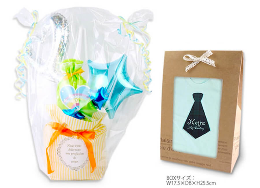 かわいらしくデコレーションされたバルーンやストライプ巾着が華やかに映える、センスの良いクリアラッピングが採用されています。